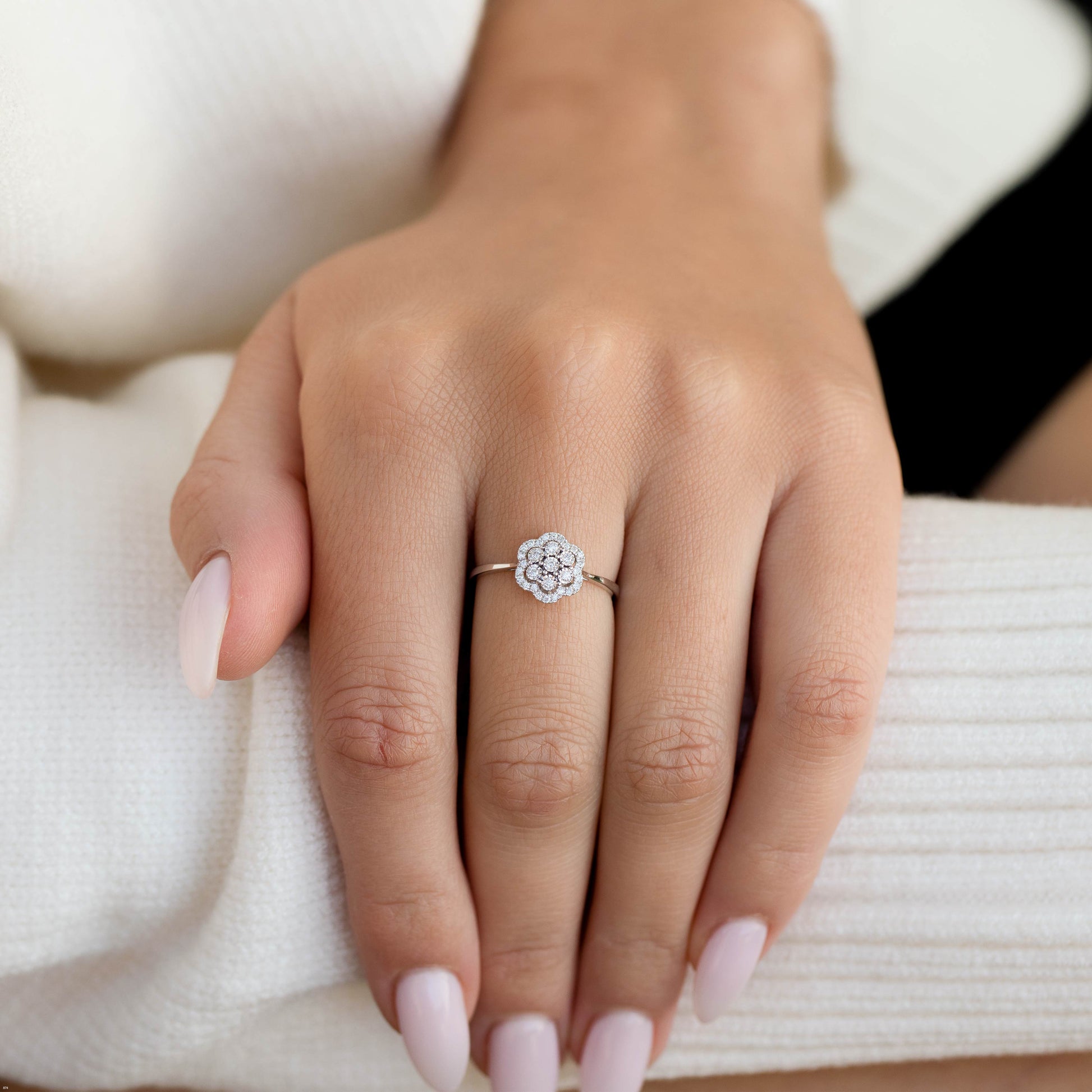 טבעת יהלומים בעיצוב פרח עדין ורומנטי, המשלבת זוהר טבעי עם אלגנטיות מעודנת.
