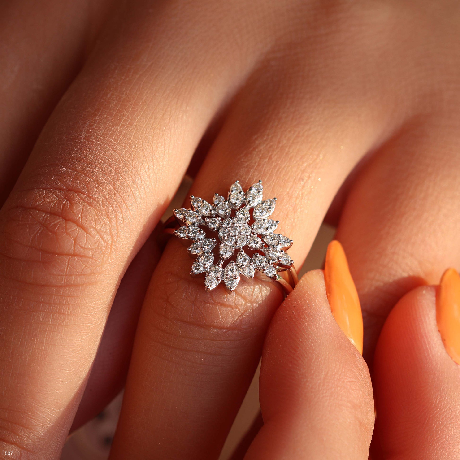טבעת יהלום מהממת משובצת 43 יהלומים איכותיים במשקל כולל של 0.574 קראט. עיצוב מתוחכם ומרשים שמשלב יוקרה עם נוכחות בולטת.