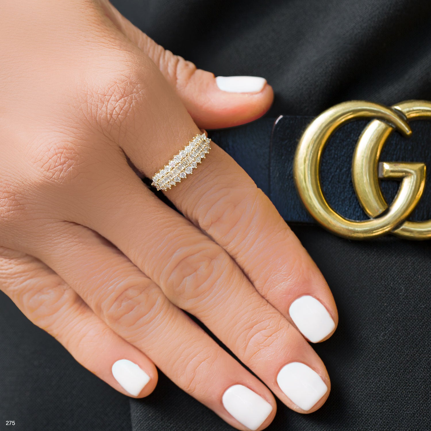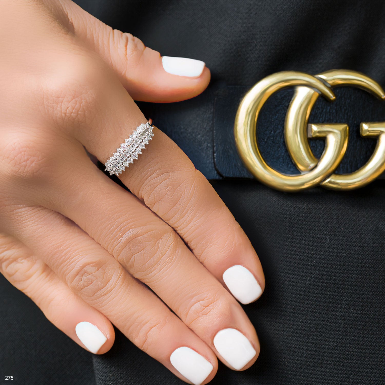 השיבוץ הצפוף של 46 יהלומים יוצר משטח רחב של ברק טהור. העיצוב המלכותי משדר נוכחות חזקה ומפוארת, ומתאים למי שמחפש תכשיט בעל אופי בולט.