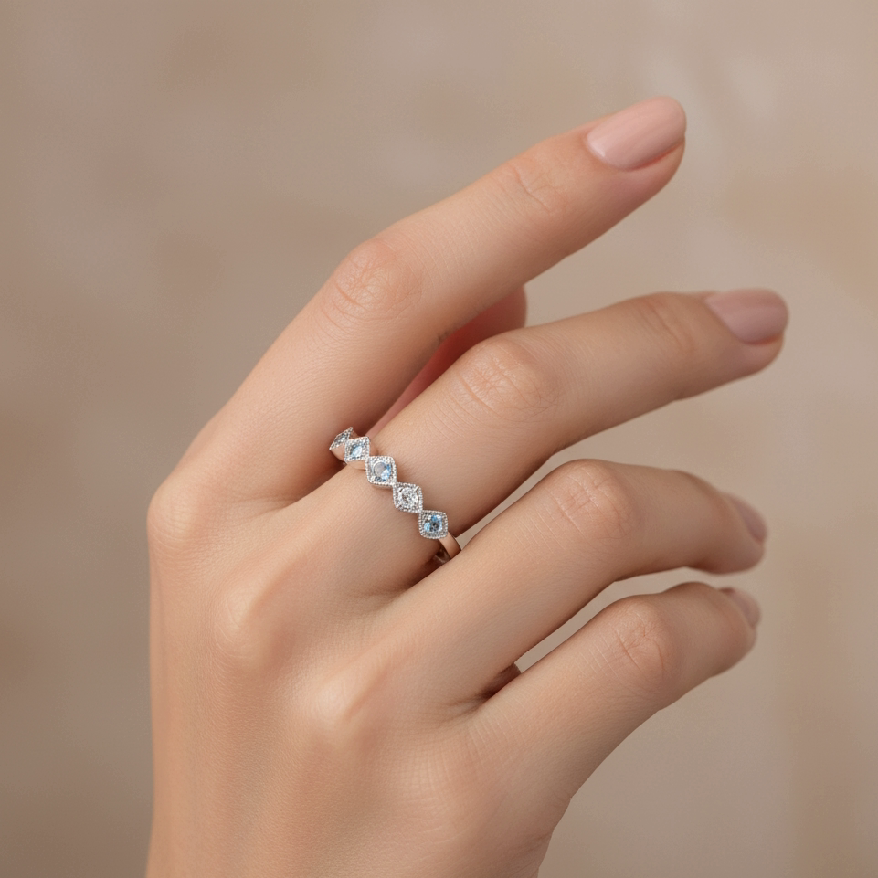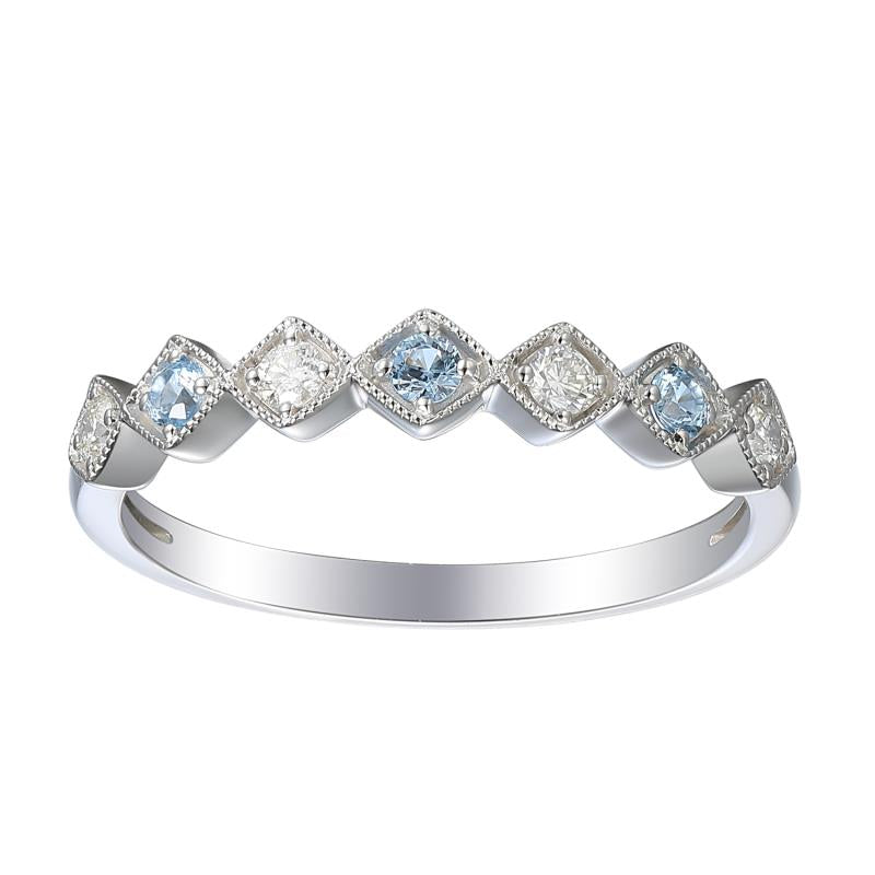 טבעת אקוומרין ויהלומים בגוון כחול-ים