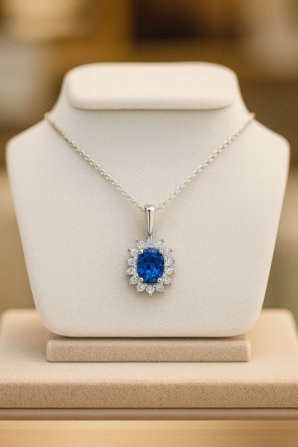 הספיר הכחול במרכז מושך את העין והיהלומים סביבו מוסיפים זוהר ויוקרה. תליון שמשלב צבע עמוק עם ברק קלאסי.