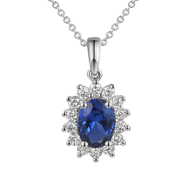 תליון מרהיב המשלב ספיר כחול עמוק עם יהלומים נוצצים.